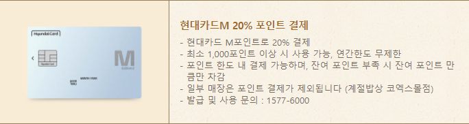 ● 현대카드 M 20% 포인트 결제 단 코엑스몰점은 포인트 결제가 제외됩니다.