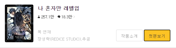 나 혼자만 레벨업은 원래 소설이 원작이고요 추공이라는 작가분이 쓰신 소설입니다. 일단 웹툰은 카카오 페이지에서 5화까지는 무료로 감상하실 수 있습니다.