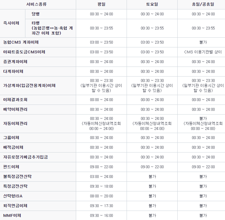 ▶ 이체 서비스 이용시간 : 이체 서비스가 실제로 점검시간이 끝나야 정상적으로 이용이 가능합니다. 이체 서비스 이용 가능 시간 확인하시기 바랍니다.