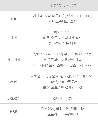 전월 실적 30만원 이상 시 제공되는 혜택이며 교통, 해외 결제, 자기 계발, 서점, 공연 등 웬만한 실생활에서 모두 포인트를 적립받을 수 있습니다.
