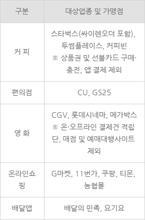 전월 실적 20만원 이상 시 제공되는 혜택이며 표에서 보는 것처럼 커피, 편의점, 온라인 쇼핑, 배달앱을 이용할 경우 혜택을 제공하고 있습니다.
