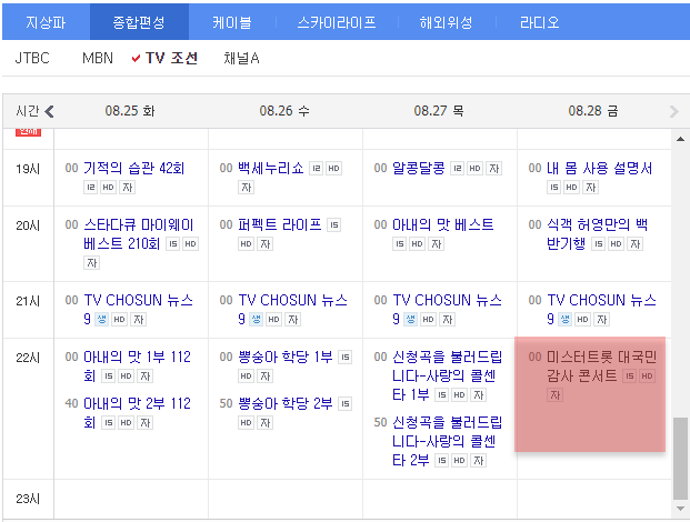 미스터 트롯 저희 부모님도 챙겨 보는 예능 프로그램인데요 지난주 미스터 트롯 대국민 감사콘서트가 중계방송되었는데요. 실시간 방송이 아니라 8월 7일부터 공연했던 걸 편집해서 내보낸 거입니다. 못 보신 분들을 위해 이번 주에도 편성이 되어 있는데요 미스터 트롯 대국민 감사콘서트 다시보기 하실 분들을 위해 재방송 시간을 알아보겠습니다.
