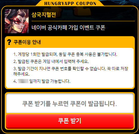 쿠폰 받는 방법이 여러 가지인데요 쿠폰의 유효기간이 있으니 지금 이 글을 쓰는 시점에는 쿠폰을 주는 이벤트가 있어도 이후에 이벤트가 종료될 수도 있다는 점 알아주세요. 첫 번째는 공식 카페 가입했을 경우 쿠폰을 발급받을 수 있습니다. 당연히 삼국지혈전 계정당 1회만 발급되며, 동일 쿠폰은 재사용이 불가능합니다.