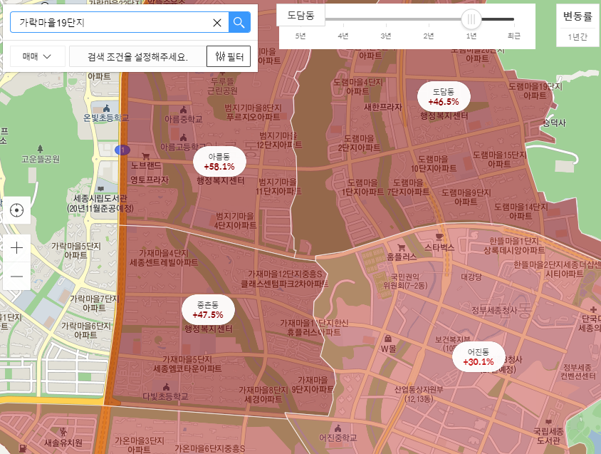 고운동에 가락마을19단지 주변 시세보다 저렴한 가격이라고 평가되고 있는 아파트 인데도 변동률 1년 기준 50% 이상 주변의 아름동, 도담동, 종촌동도 같이 오른 추세 입니다.