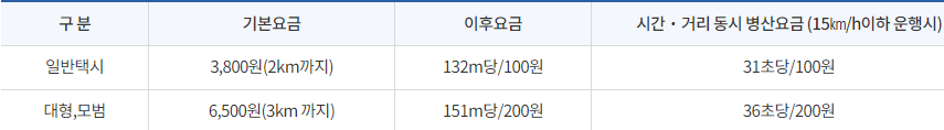 일반택시의 경우 2km 3,800원 대형, 모범의 경우 3km에 6,500원이 기본요금으로 책정되어 있습니다.