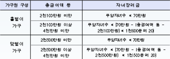 18세 미만 자녀가 있다면 자녀장려금도 신청을 할 수 있는데요 자녀장려금 산정표는 아래와 같습니다. 총급여액 등 부양자녀수에 따라 가구원 구성에 따라 산정표가 구분이 될 수 있습니다.