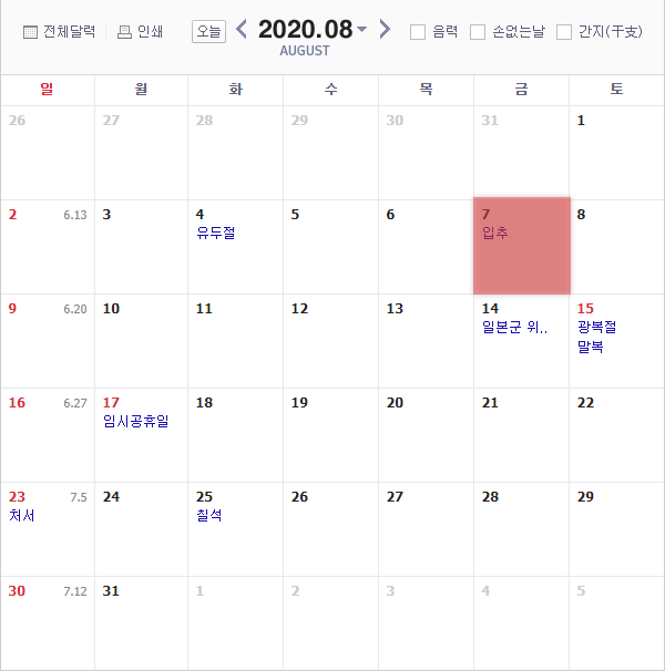 2020년 입추는 언제