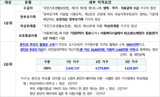 세부 자격요건은 1순위가 수급자, 한부모가족, 차상위계층, 보호종료아동으로 1순위가 될 수 있습니다.