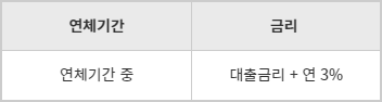 이때 매월 이자납입일 기준 미납금액이 발생하면 연체 금리가 발생하는데 대출금리에 연 3%가 더 발생되며 연체금리의 최고율은 연 15%이며 만약 대출금리가 연 15%이상인 경우에는 대출금리 + 연 2%를 적용합니다.