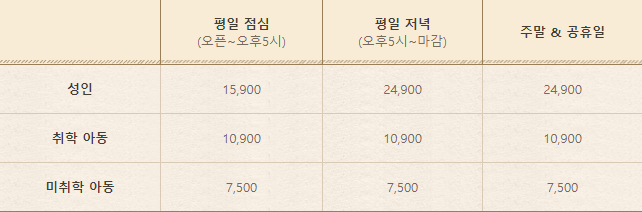 런치는 평일에는 운영을 하고 있는데요 주말 공휴일은 런치와 디너가격이 동일합니다. 평일 기준 런치 시간 성인은 15,900원 디너 24,900원입니다.