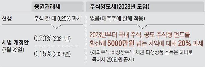 23년부터 주식 양도소득세를 도입해 연 5,000만원을 넘는 이익에 대해 20% 세금을 매긴다. 5,000만 원에는 주식형 펀드 수익도 해당된다.